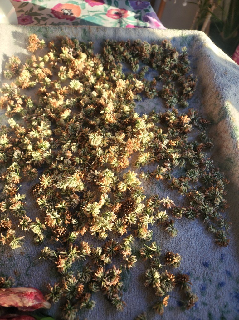 Top: The clovers are washed, spin dried, and placed on a clean towel to dry a few days. Bottom: My dried clovers and tea💖 This is the most refreshing non caffinated tea. Oh yeah! There’s also added medicinal benefits😃