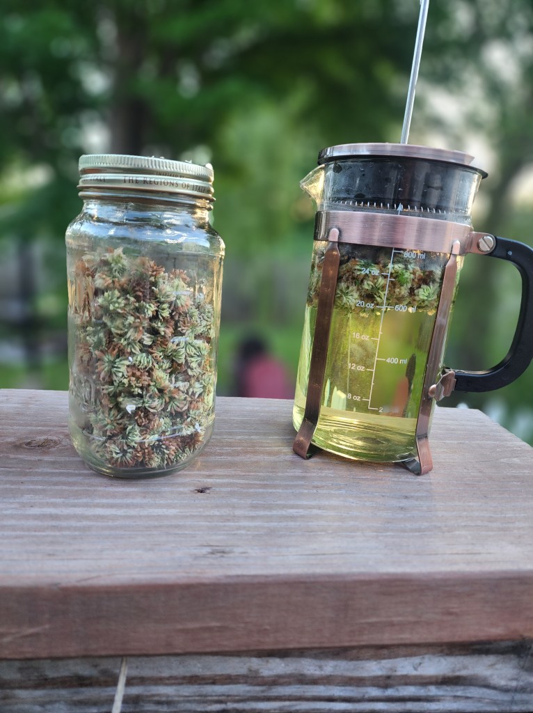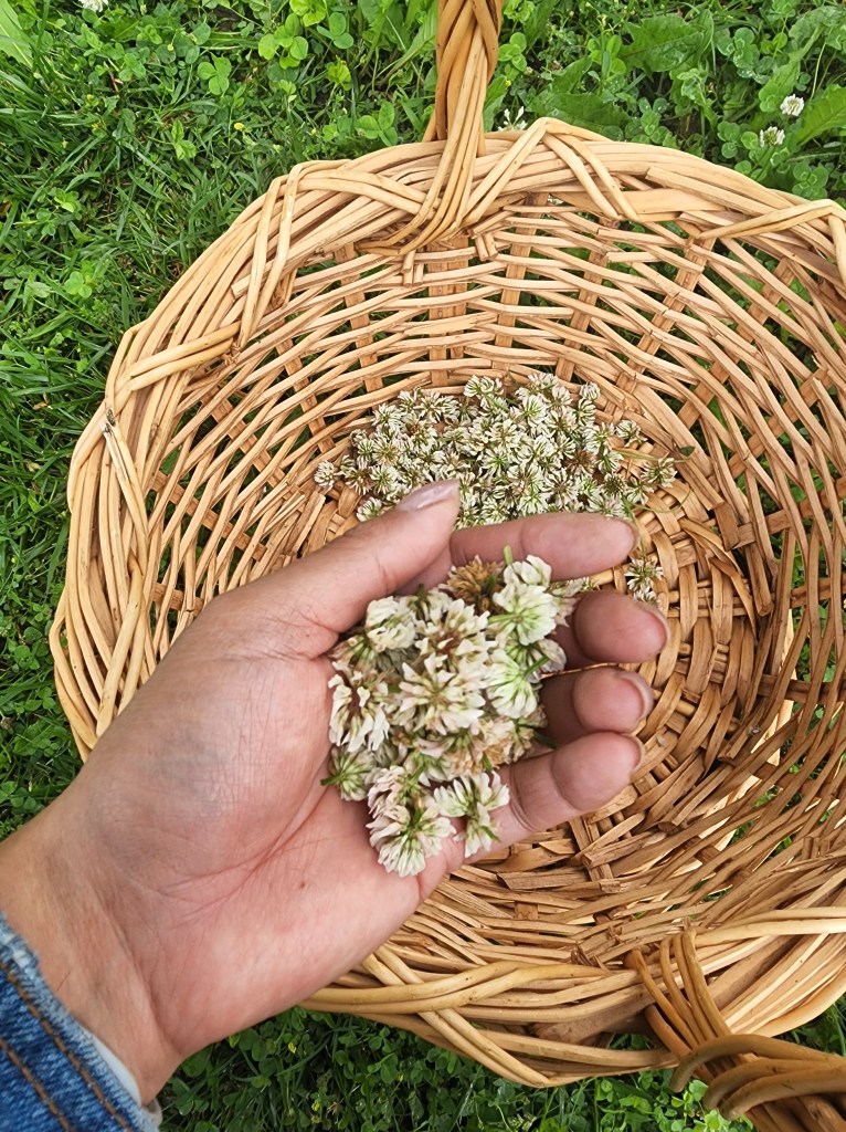 I don’t know about you but I feel like this has been the longest Spring I’ve ever encountered. It’s been rainy and mildly cool days and nights. I was looking for grounding on a particular misty day and decided to forage some newly bloomed white clover buds. I grabbed a basket and headed out to the backyard under my maple for cover and started my tedious task of picking.